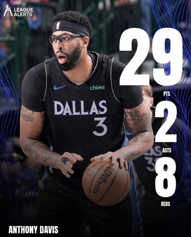 本场比赛,独行侠内线安东尼-戴维斯出场30分16秒,19投14中得到了29分8篮板2助攻2抢断1盖帽,三分球1中0,罚球2中1,出现了0次失误和3次犯规,正负值为+11。
